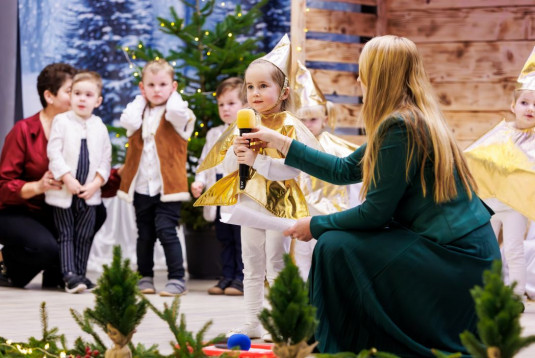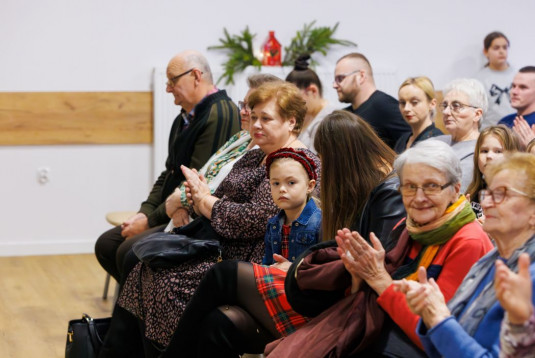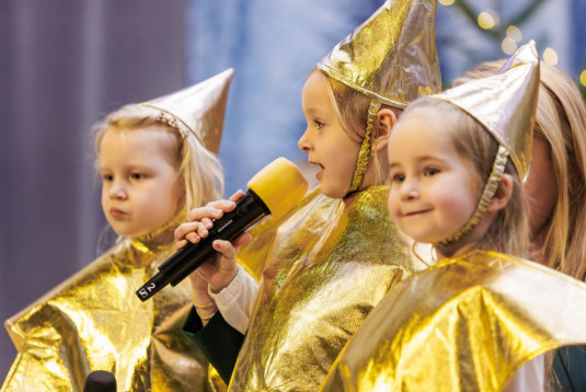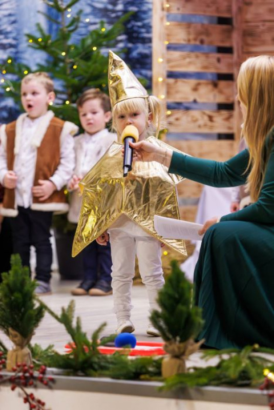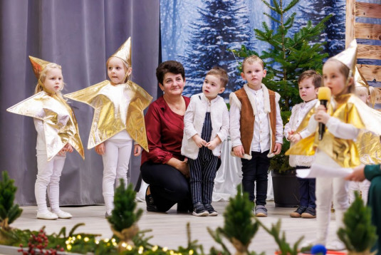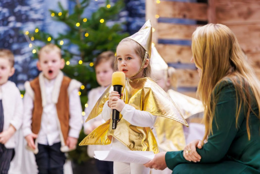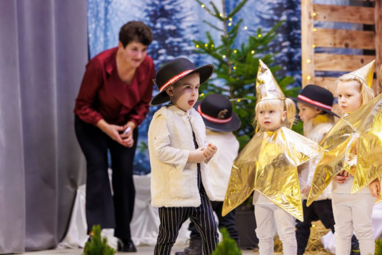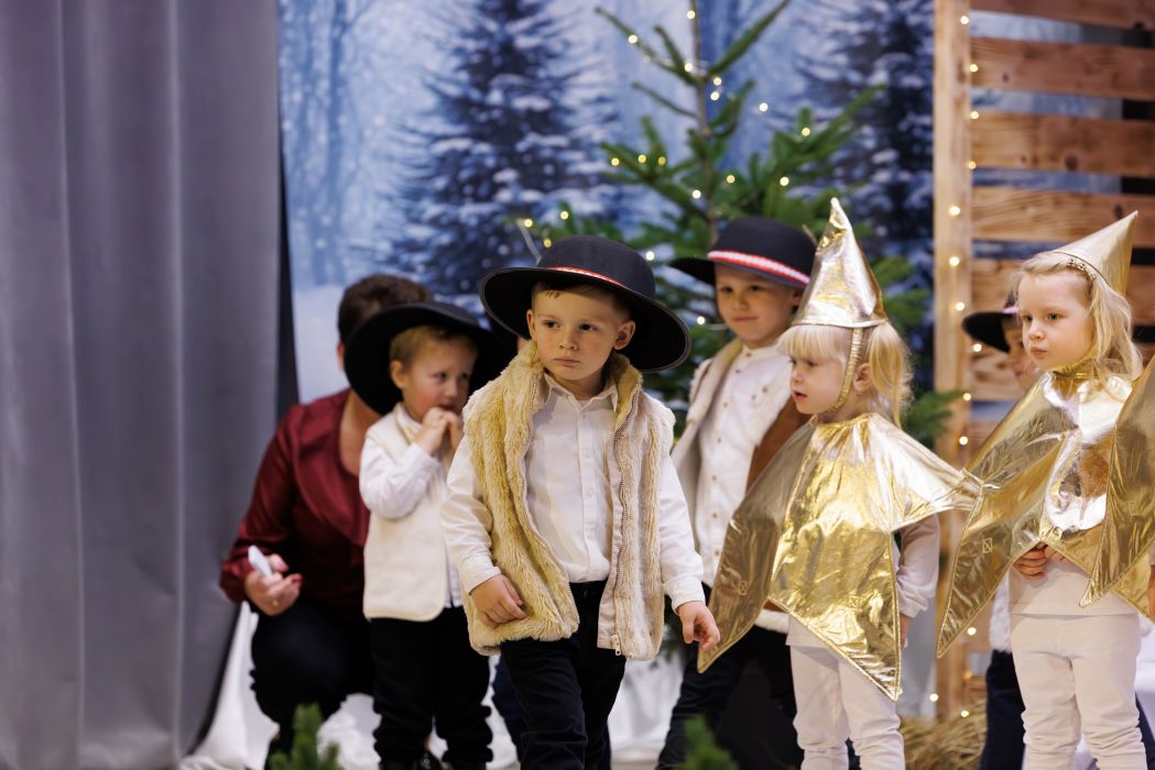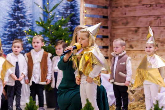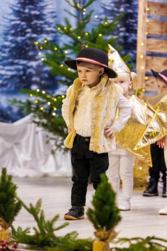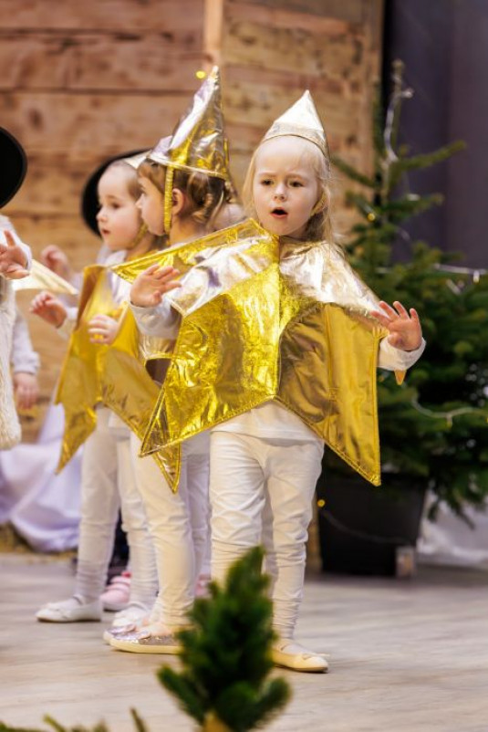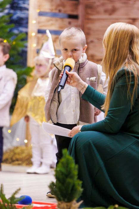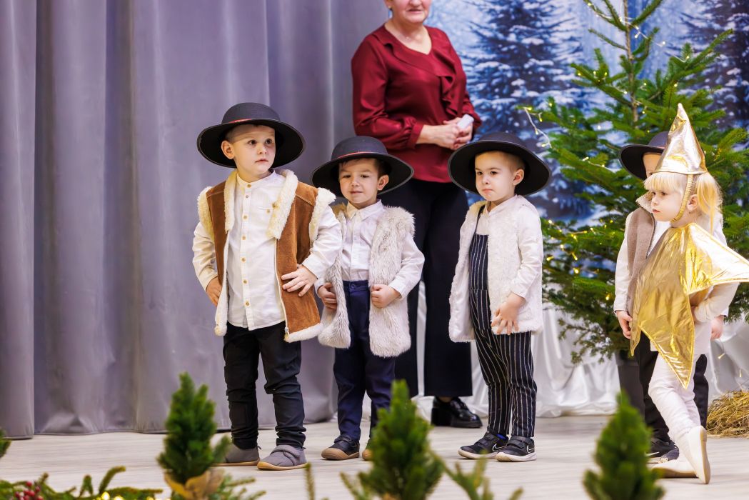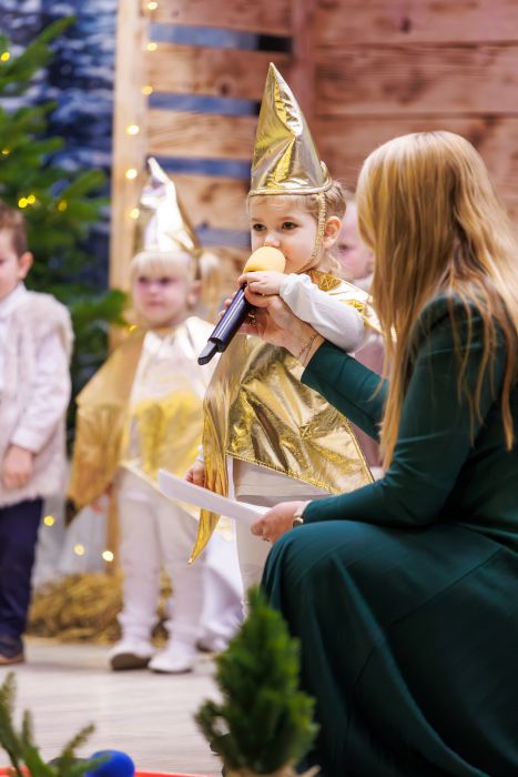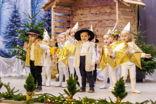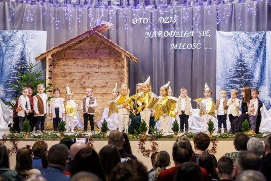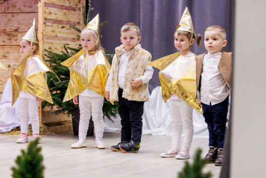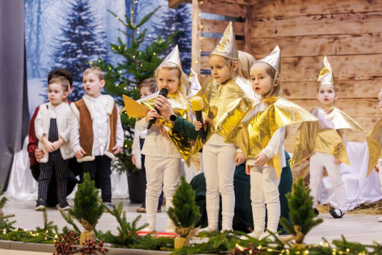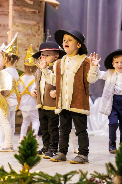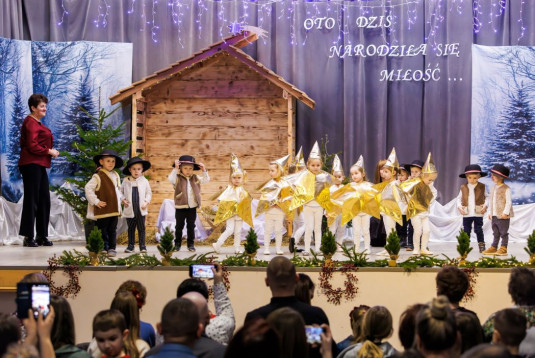 Dzieci z dużym zaangażowaniem odgrywały swoje role, oddając atmosferę świąt Bożego Narodzenia, pełną ciepła, rodzinnej bliskości i serdeczności. W przepięknych strojach przedstawiły historię narodzin Dzieciątka Jezus, a wszystko to w oprawie kolęd i pastorałek. Scenografia przygotowana przez przedszkolanki nadała spotkaniu uroczysty i magiczny klimat. Maluchy do występu przygotowały wychowawczynie Anna Niemiec i Magdalena Bieleń.