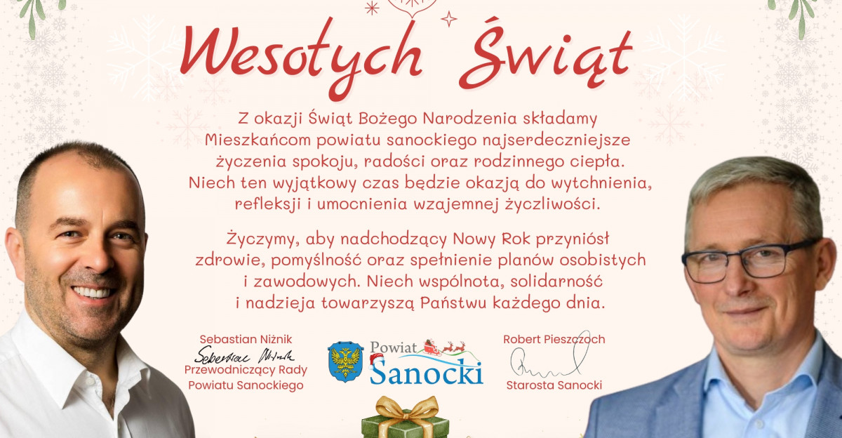 Z okazji Świąt Bożego Narodzenia życzenia Mieszkańcom Powiatu Sanockiego składają Starosta Sanocki Robert Pieszczoch oraz Przewodniczący Rady Powiatu Sanockiego Sebastian Niżnik: