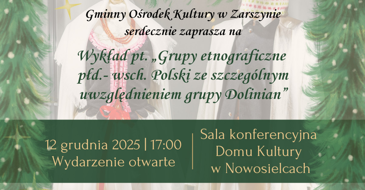 Gminny Ośrodek Kultury w Zarszynie zaprasza wszystkich miłośników historii i regionalnego dziedzictwa na otwarty wykład pt. „Grupy etnograficzne płd.-wsch. Polski ze szczególnym uwzględnieniem grupy Dolinian”. Wydarzenie, które odbędzie się 12 grudnia, będzie jednocześnie uroczystym podsumowaniem projektu „Przeszłość w sercu, przyszłość w dłoniach”.