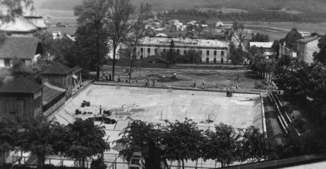 Fotografia przedstawia budowę basenu kąpielowego poniżej budynku Towarzystwa Gimnastycznego „Sokół” (teren późniejszego lodowiska). Poniżej miejsce, na którym obecnie znajdują się korty tenisowe. Po lewej stronie basenu widoczny budynek starej kręgielni, u dołu fotografii fragment, nieistniejącego już, kortu tenisowego oraz fragment dachu budynku Towarzystwa Gimnastycznego „Sokół”. Na drugim planie widoczny budynek koszar, a dalej dzielnica Wójtostwo oraz Biała Góra i zalesione wzgórza Gór Słonnych. Po prawej stronie widoczna charakterystyczna kopuła dachu Domu Żołnierza (obecnie Sanocki Dom Kultury). Poniżej Domu Ĺ»ołnierza widoczny fragment zakładu fotograficznego Franciszka Strachockiego. Widoczny również dolny odcinek ul. Mickiewicza. Fotografia wykonana z dachu budynku Towarzystwa Gimnastycznego „Sokół”. Czas powstania: 1940 r.