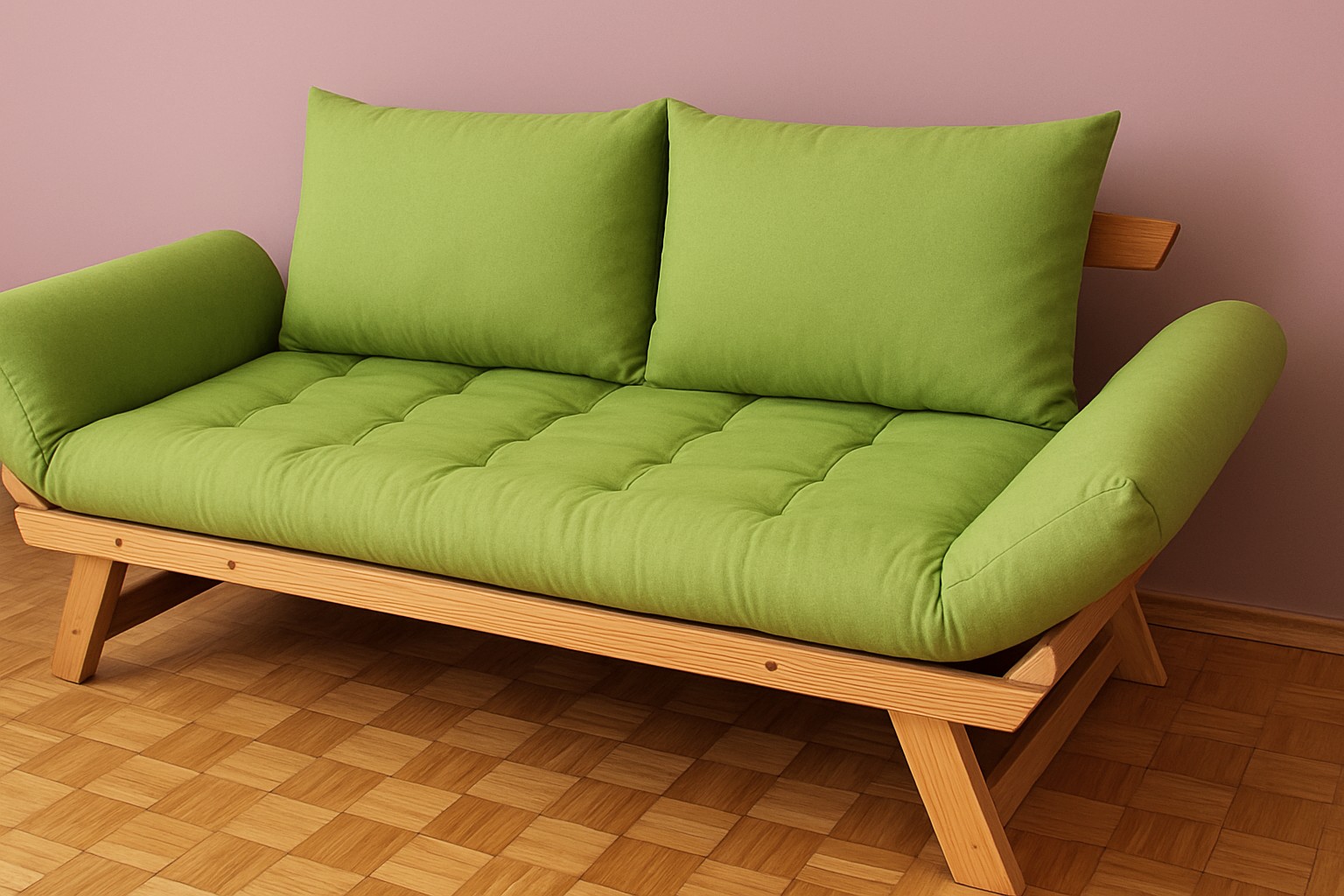 Stelaż: stanowi główną zaletę sofy, lite drewno, stabilna konstrukcja, na listwach.