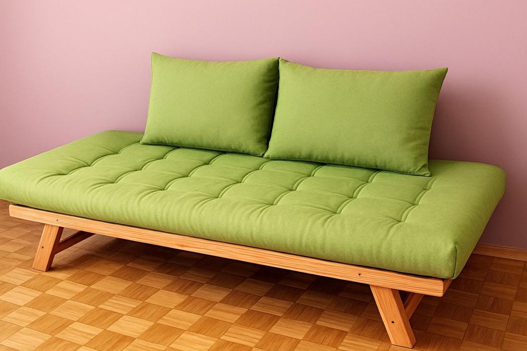 Futon (ok. 12 cm grubości): wypełniony naturalnym materiałem z włókniną bawełnianą obszyty mocnym pokrowcem pikowanym kuzikami (oczywiście można go zastąpić materacem odpowiednich rozmiarów).