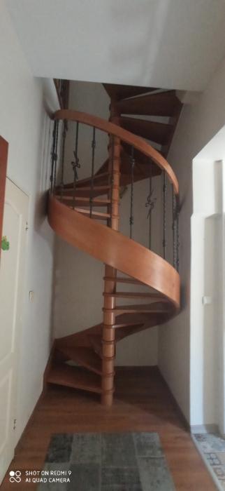 Parter połączony jest z piętrem drewnianymi krętymi schodami.