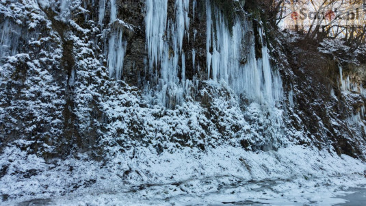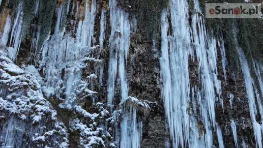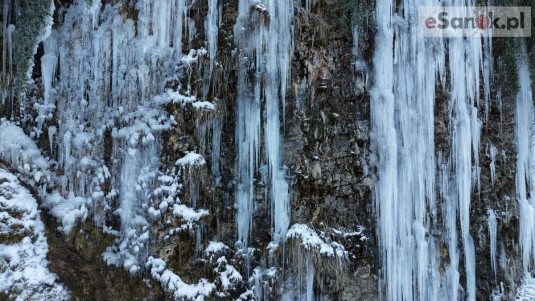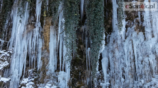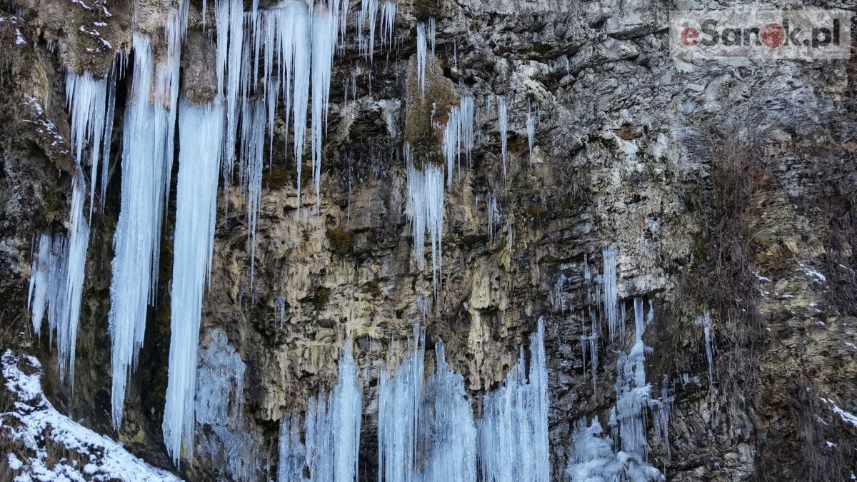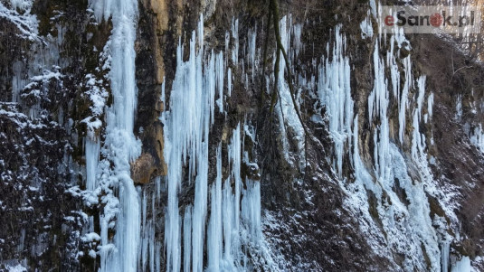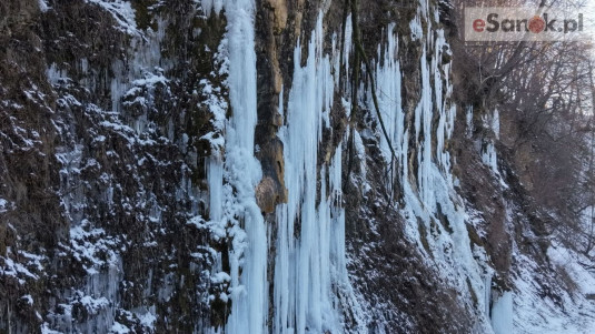 Z perspektywy drona lodospady prezentują się jeszcze bardziej imponująco. Zamarznięte kaskady kontrastują z ciemnymi skałami i białym śniegiem, tworząc obraz niemal bajkowy. Tego typu ujęcia pozwalają dostrzec to, czego nie widać z poziomu ziemi – rozległość zjawiska oraz jego harmonijne wkomponowanie w otaczający krajobraz Beskidu Niskiego.